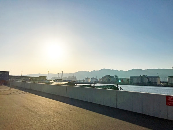 43, 野鳥園前エリアはるか遠方に見える港コンテナを背景に