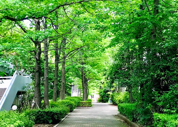 13, みどりの並木道南北に延びる、最も大きな並木道 新緑や紅葉、年を通して人気のエリア 高架を隔てて左右に2本あります