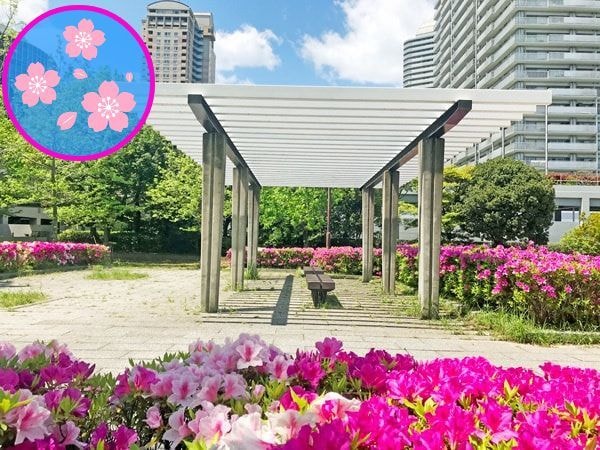 28, 🌸さくらとツツジ エリア🌸桜も咲きます! 春のイチオシ!(桜とツツジ) ツツジいっぱいに囲まれた、華やかなベンチ 桜、ツツジ、紅葉で楽しめます 遊具もあります