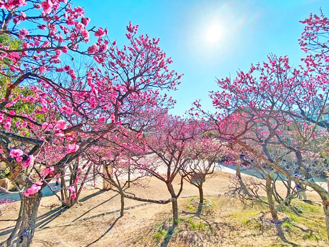37, 梅林 エリア1月、2月のイチオシ!(梅) 紅白の梅が乱立する梅林 梅は丘の上にも広域に咲いています