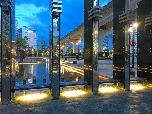 川辺に沿う美しい光のラインとその街並みは、昼間とは異なる幻想的な雰囲気を演出し、写真映えする背景になります。